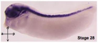 l1cam (L1 cell adhesion molecule) gene expression in Xenopus tropicalis embryo, assayed via in situ hybridization, NF stage 28, lateral view, anterior left, dorsal up. |