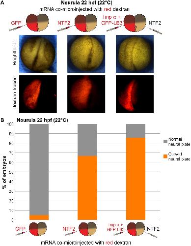 (A) Two-cell embryos were microinjected as indicated and allowed to develop to 22 hpf neurula. Representative images are shown. (B) Neurula were scored as having normal or curved neural plates by drawing a line through the middle of the embryo. Embryo numbers: n = 19 for GFP, n = 21 for NTF2, n = 7 for imp α + GFP-LB3/NTF2.