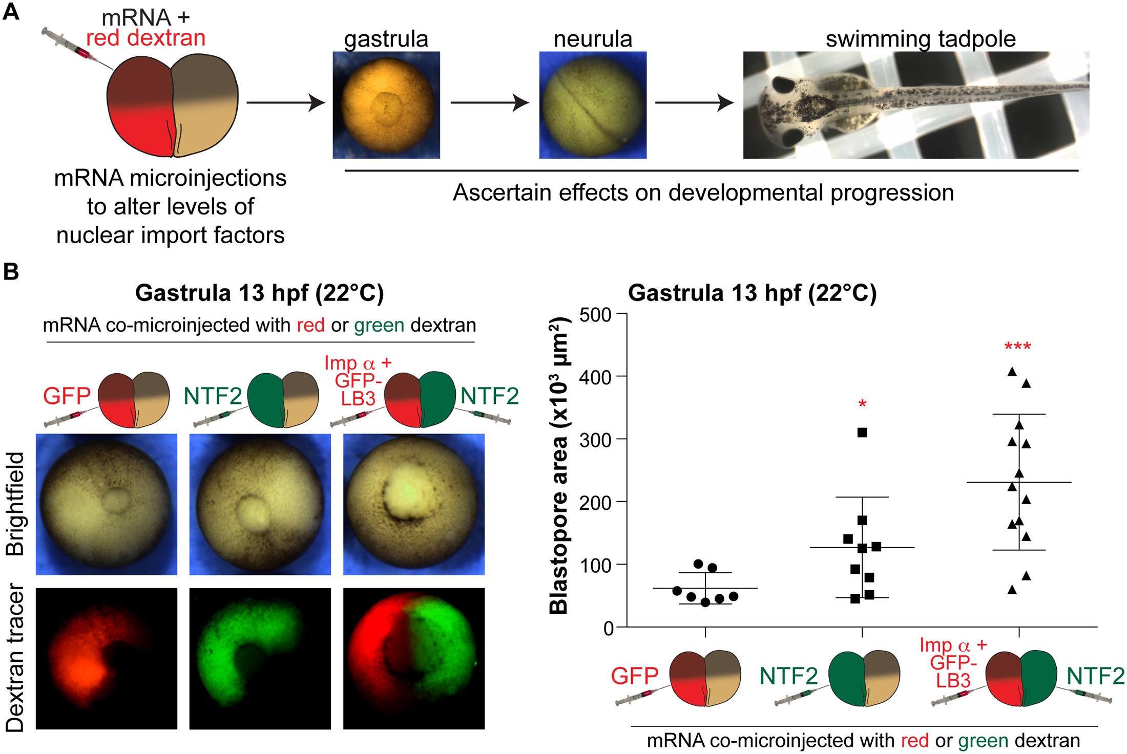 (A) Experimental approach. One blastomere of a two-cell stage X. laevis embryo was co-microinjected with mRNA to alter nuclear import factor levels and fluorescently labeled dextran as a cell tracer. Embryos were allowed to develop to different stages to assess effects on developmental progression. (B) Microinjections were performed as shown in (A) with 250 pg GFP mRNA, 175 pg NTF mRNA, or 250 pg importin α mRNA + 250 pg GFP-LB3 mRNA. These amounts, that maximally affect nuclear size [13, 24], were used in all experiments. Microinjected two-cell embryos were allowed to develop to 13 hpf gastrula. Representative vegetal pole images are shown. Blastopore area was measured and averaged for 7–13 embryos per condition. Blastopore closure appeared symmetric in all conditions. Error bars represent SD. *** p<0.005, * p<0.05.