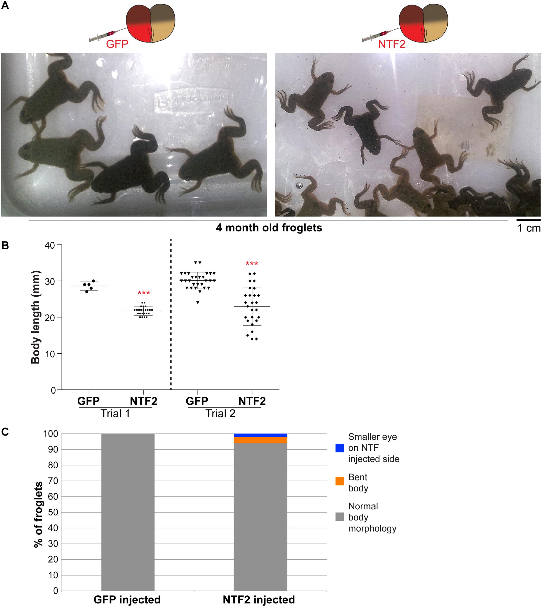 Two-cell embryos were microinjected as indicated and allowed to develop into 4-month-old froglets. Froglet numbers: trial 1 GFP n = 5, trial 1 NTF2 n = 24, trial 2 GFP n = 28, trial 2 NTF n = 26. (A) Representative froglets. (B) Quantification of froglet length is shown. Average body mass for froglets derived from NTF2-microinjected embryos was 59% ± 11% (average ± SD) of control froglets. Error bars represent SD. *** p<0.005. (C) Scoring of froglets with altered body morphology as indicated. We did not note any obvious differences in the timing of the onset of metamorphosis for GFP- and NTF2-injected animals.