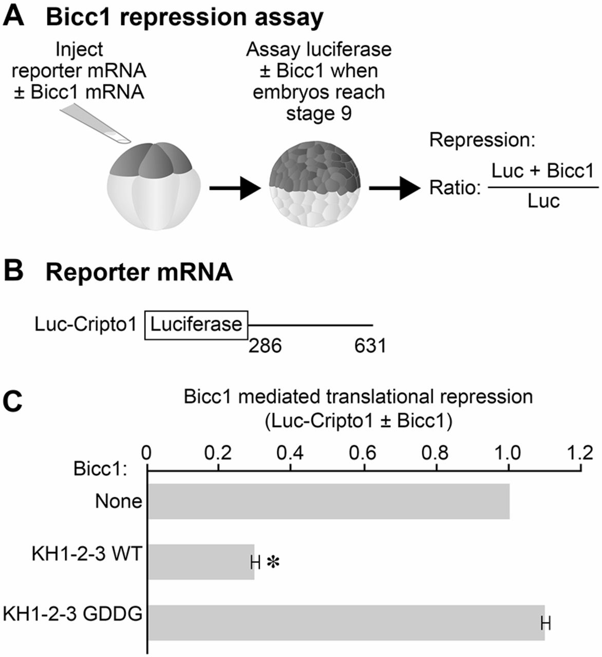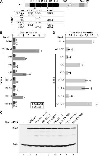 The Bicc1 KH domains are required for translational repression. (A) Animal cell assay for Bicc1 translational repression. Animal cells of eight-cell Xenopus embryos were injected with luciferase reporter mRNAs. Some of the embryos were given a second injection of mRNA encoding full-length Xenopus Bicc1 (Zhang et al., 2013). When embryos reached stage 9-10, luciferase assays were performed. Repression, measured by the ratio of luciferase exhibited by a reporter mRNA with and without Bicc1 expression, was calculated and plotted. (B) Diagram of Cripto1 3â²UTR fragment incorporated into luciferase reporter mRNAs used to analyze translational repression. (C) The Bicc1 protein containing GDDG substitutions (KH1-2-3 GDDG) was defective for repressing the Luc-Cripto1 reporter mRNA, while the Bicc1 wild-type protein repressed the reporter efficiently. Data are mean± s.e.m. from three separate experiments. *Pt-test) wild type compared with no Bicc1 control.