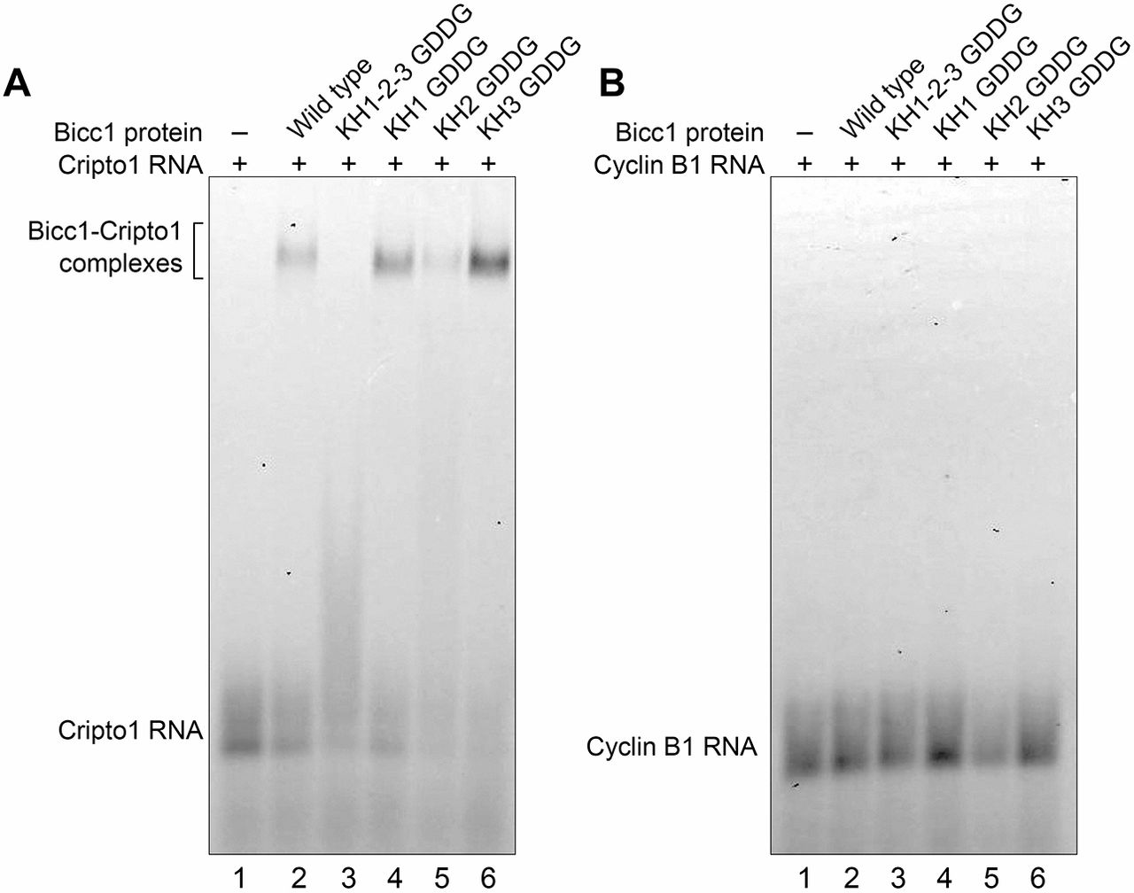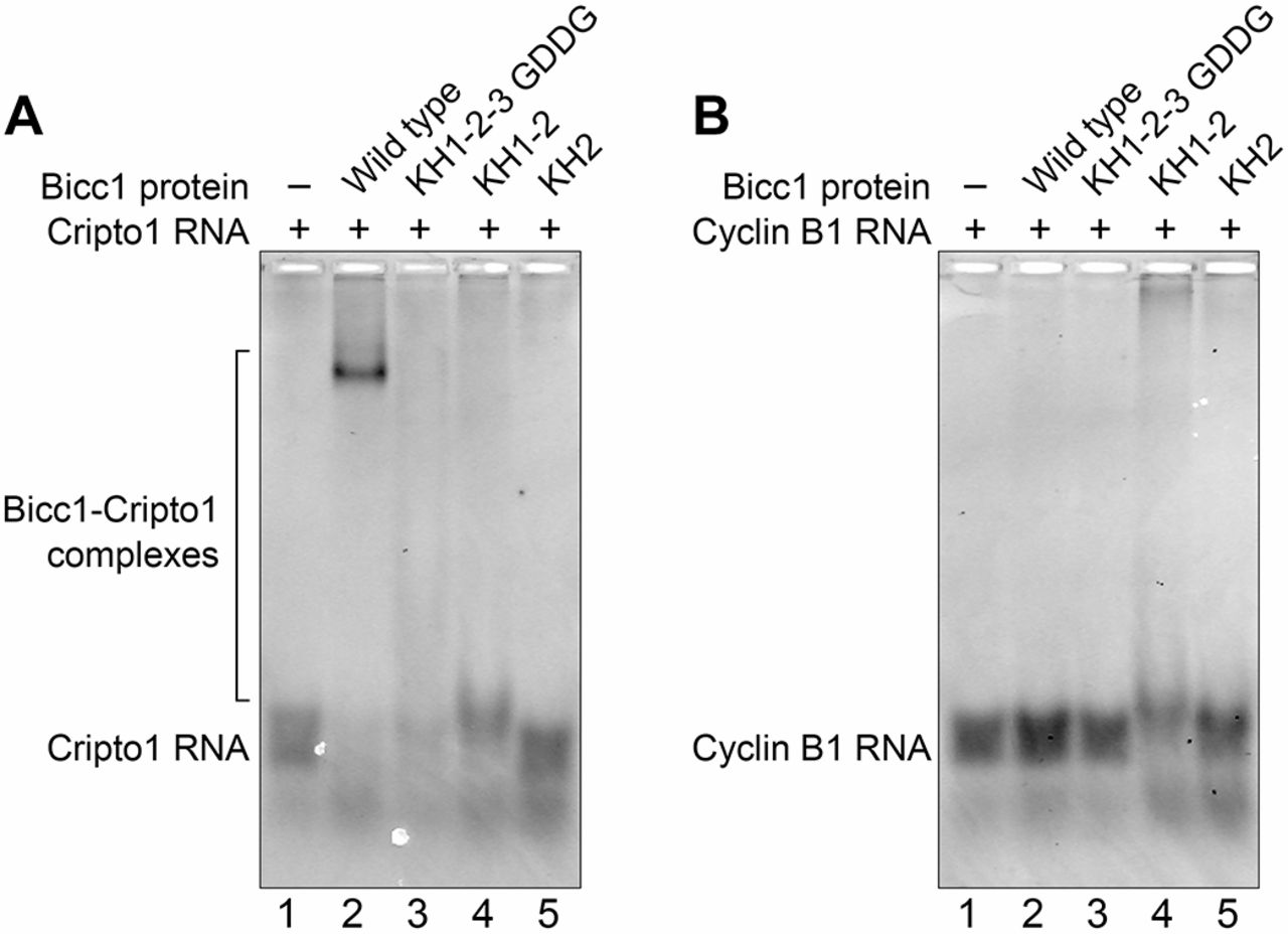The Bicc1 KH2 domain is required for direct interaction with RNA targets. (A) Electromobility shift assays of Bicc1 wild-type and protein variants, and RNA substrate that is the Bicc1-binding site from the 3â²UTR of the Xenopus Cripto1 mRNA. Recombinant proteins consisting of the Bicc1 N terminus (amino acids 1-506) were expressed and purified from E.coli. Wild-type protein, along with KH1 GDDG, KH2 GDDG, KH3 GDDG and KH1-2-3 GDDG, were generated for analysis. Binding reactions consisting of the different proteins mixed with a fluorescently labeled 32 nucleotide RNA representing a well-characterized Bicc1-binding site derived from the 3â²UTR of the Xenopus Cripto1 mRNA were analyzed on native polyacrylamide gels electrophoresed horizontally (Dowdle et al., 2017). The KH2 GDDG and KH1-2-3 GDDG proteins were defective for complex formation compared with wild-type Bicc1 and other Bicc1 variants. (B) Electromobility shift assays of Bicc1 wild-type and protein variants, and an RNA substrate derived from the 3â²UTR of the Xenopus Cyclin B1 mRNA. The Cyclin B1 mRNA is not a Bicc1 target and represents a negative control for binding.