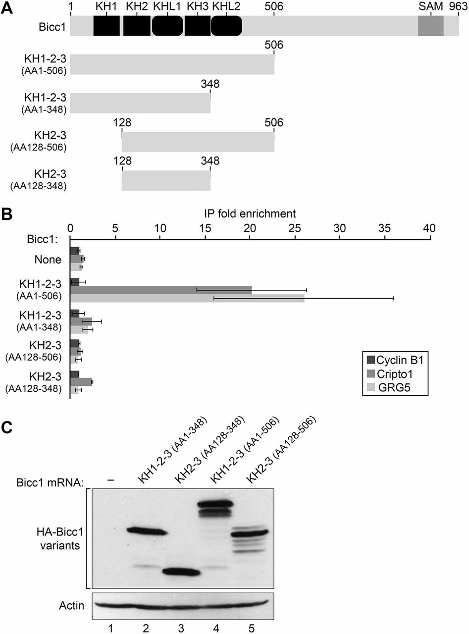 The entire N-terminal region of Bicc1 is required for RNA binding in vivo. (A) Diagram of the intact Bicc1 N-terminal region (KH1-2-3 amino acids 1-506) and the different derivatives that lack KHL2 (KH1-2-3 amino acids 1-348), lack KH1 (KH2-3 amino acids 128-506) or lack KH1 and KHL2 (KH2-3 amino acids 128-348). (B) The endogenous Xenopus maternal Cripto1 and GRG5 mRNAs were bound by the intact Bicc1 N terminus, but none of the derivatives lacking different regions bound to these mRNAs. None of the proteins bound to the Cyclin B1 mRNA, a negative control for this experiment as Cyclin B1 is not a Bicc1 target. Data are mean±s.e.m. from three separate experiments. (C) Immunoblot analysis with an anti-HA antibody was used to monitor the expression of the different protein variants used in RNA-binding assays.