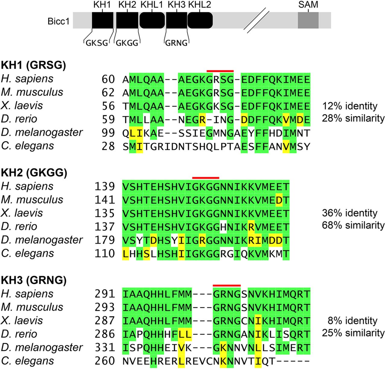 The KH2 domain is an evolutionary conserved feature of Bicc1 proteins. Amino acid sequences from vertebrate and invertebrate Bicc1 proteins were analyzed with Clustal Omega. The regions surrounding the GXXG motif (red line) of each KH domain are shown. Residues identical to human Bicc1 are highlighted in green, while similar residues are highlighted in yellow. The comparison of full-length Bicc1 proteins is presented in Fig. S4.
