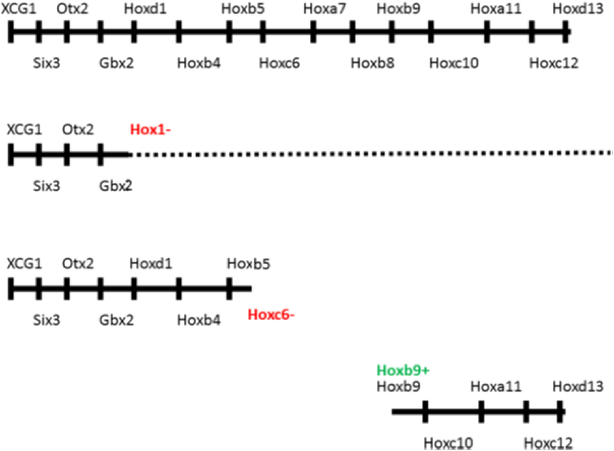 Genes referenced: birc6 clock gbx1 gbx2 gbx2.2 gdf11.2 hoxa11 hoxa7 hoxb4 hoxb5 hoxb7 hoxb8 hoxb9 hoxc10 hoxc12 hoxc6 hoxd1 hoxd10 hoxd13 hoxd4 muc2 nog otx2 six3 tst