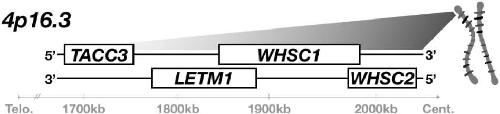 FIGURE 1. WHS is typically caused by heterozygous microdeletion of numerous genes within 4p16.3. A segment of this region is illustrated here. A microdeletion that spans at least WHSC1, WHSC2, and LETM1 is currently assumed to be necessary for full WHS diagnostic presentation; children affected by the disorder often possess larger deletions that extend further telomeric and impact additional genes, such as TACC3. |
