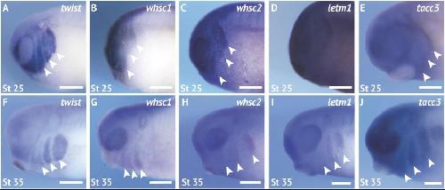 FIGURE 2. WHS related genes are expressed in the migrating neural crest cells during embryonic development. (A,F) Lateral views of whole mount in situ hybridizations for twist, a CNC-enriched transcription factor. Arrows indicate the pharyngeal arches (PA). (BâE,GâJ) In situ hybridizations for whsc1, whsc2, letm1, and tacc3 demonstrate enrichment in CNCs that occupy the PAs (n = 20 per probe, per timepoint). Scalebar is 250 μm. |