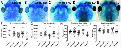 FIGURE 4. Knockdown of Whsc2 and Tacc3 impact cartilage morphology. (AâE) Ventral view of 6dpf embryos following single WHS-assoc. gene KD, stained with Alcian Blue to label cartilage elements. (FâI) Measurements of the average area and width of the ceratohyal cartilage, total cartilage area, and width of the brachial arches. Neither Whsc1 nor Letm1 KD caused a significant change in any measured parameter. Whsc2 KD caused a 27.94% decrease in average area of the ceratohyal cartilage, and a 23.87% decrease in area of all craniofacial cartilage. Tacc3 KD caused a 48.5% decrease in the average area of the ceratohyal cartilage, a 24.03% decrease in total cartilage area, and a 28.58% decrease in ceratohyal cartilage width. Significance was determined using a studentâs unpaired t-test. (Embryos quantified: Control = 17, Whsc1 KD = 41, Whsc2 KD = 39, Letm1 KD = 34, Tacc3 KD = 11.) ââââP < 0.0001, âââP < 0.001, âP < 0.05, n.s., not significant. Scalebar is 250μm. |