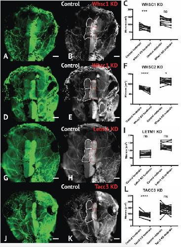 FIGURE 7. Whsc1, whsc2, and tacc3 facilitate normal forebrain development. (A,B,D,E,G,H,J,K) Dorsal view of X. laevis half-embryo gene depletions (6 days post-fertilization), following alpha-tubulin immunolabeling to highlight nervous system. (B,E,H,K) Dorsal view of embryos with superimposed outlines of forebrain and midbrain structures. Internal control is on left (white), depleted side is on right (dashed red). (Alpha-tubulin staining is bilateral; exogenous eGFP on KD side persisted in embryos shown, causing a unilaterally enriched green signal.) (C,F,I,L) Area of forebrain and midbrain. Whsc1 KD reduced forebrain area by 17.65%. Whsc2 KD reduced forebrain area by 17.33% and midbrain area by 4.14%. Letm1 KD caused no significant change in brain size. Tacc3 KD caused a 16.05% decrease in forebrain area. Significance determined using a studentâs paired t-test. (Embryos quantified: Whsc1 KD = 14, Whsc2 KD = 18, Letm1 KD = 12, Tacc3 KD = 26.) ââââP < 0.0001, âââP < 0.001, âP < 0.05, n.s., not significant. Scalebar is 250 μm. |
