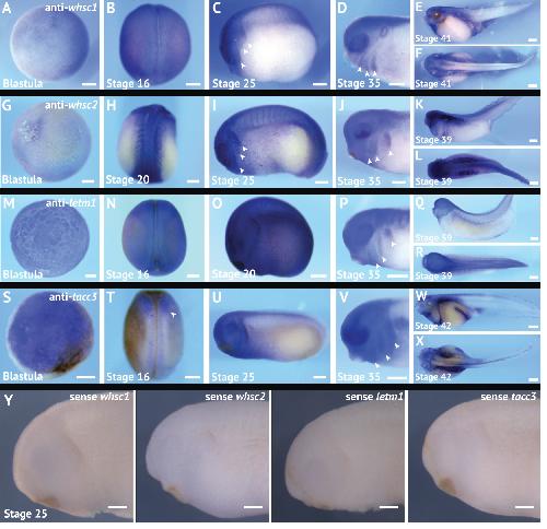 FIGURE S1 | Expression patterns for WHS related genes across early development. In situ hybridization utilized (AâF) antisense mRNA probe to whsc1, (GâL) full-length antisense mRNA probe to whsc2, (MâR) full-length antisense mRNA probe to letm1, and (S-X) 1 kb partial-length antisense mRNA probe to tacc3. Embryos shown at blastula stage (A,G,M,S), in dorsal view at stage 16â20 (B,H,N,T), in lateral view at stage 20â25 (C,I,O,U), detail of lateral anterior region at stage 35 (D,J,P,V), and in both lateral and dorsal views from stages 39â42 (E,K,Q,W and F,L,R,X). (Y) In situ hybridization probes generated against sense strands of WHS gene mRNAs, shown at stage 25. Brown coloration (S,T) is unbleached pigment, unrelated to in situ hybridization staining. Scalebar is 250 μm.bryos were anesthetized with benzocaine. |