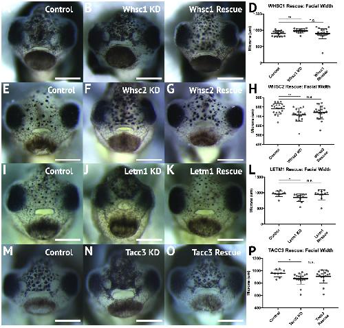 FIGURE S4 | Craniofacial defects caused by WHS-associated gene KD are rescued by co-injection of exogenous mRNA co-expression. Facial widths from control, depletion, or rescue strategies were measured in tadpoles (st. 40). Row 1: Embryos injected with (A) control MO (n = 17), (B) 10 ng whsc1 MO (n = 14), or (C) 10 ng of whsc1 MO and 250 pg of whsc1 exogenous mRNA. (D) Comparisons of facial width showed an 8.76% increase in facial width with Whsc1 KD, which was rescued by whsc1 mRNA co-injection. Row 2: Embryos injected with (E) control MO (n = 21), (F) 10 ng whsc2 MO (n = 17), or (G) both 10ng of whsc2 MO and 250 pg of whsc2 mRNA (n = 19). (H) Whsc2 knockdown caused an 8.37% reduction in facial width, which was rescued by exogenous whsc2 mRNA co-injection. Row 3: Embryos injected with (I) control MO (n = 10), (J) 20 ng of letm1 MO, or (K) 20 ng letm1 MO and 1500 pg of letm1 mRNA (n = 11). (L) KD of Letm1 caused a 14.95% decrease in facial width, and was rescued by co-injection of exogenous letm1 mRNA. Row 4: Embryos injected with (M) control MO (n = 9), (N) 20 ng of tacc3 MO (n = 18), or O) 20 ng of tacc3 morpholino and 1000 pg of tacc3 mRNA (n = 16). (P) Tacc3 KD resulted in a 9.01% decrease in facial width, and was rescued by tacc3 mRNA co-injection. Significance determined using a studentâs unpaired t-test. ââP < 0.01, âP < 0.05, n.s., not significant. Scalebar is 250μm. |