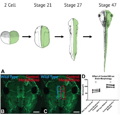 FIGURE S5 | Half embryo knockdown can be utilized for analysis of brain morphology and neural crest cell migration in vivo. (A) At the 2-cell stage, a single blastomere is injected with WHS-associated gene MOs and exogenous eGFP mRNA. After neurulation (approx. stage 21), embryos are sorted based on left or right eGFP fluorescence, to determine side of depletion. To examine neural crest cell size, migration and morphology embryos were fixed between stage 25â30, and in situ hybridization was performed using twist anti-sense probe. To characterize brain morphology, embryos were raised to st. 47, and fixed and labeled with alpha-tubulin antibody, a neuronal marker, and Alexa-488 secondary. (BâD) Control MO does not significantly impact brain size, compared to non-injected hemispheres (a paired internal control). |