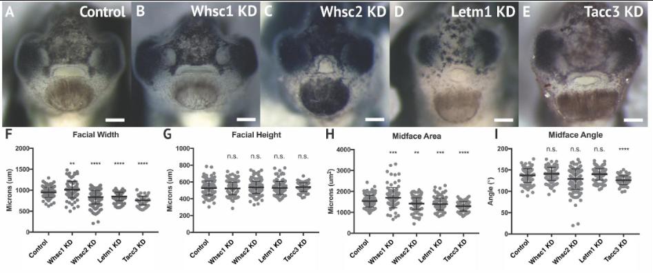 FIGURE 3. WHS related gene depletion affects craniofacial morphology. (AâE) Frontal views of 3dpf embryos (st. 40) following WHS gene single KD. (FâI) Measurements for facial width, height, midface area, and midface angle. A significant 6.54% increase in facial width and 11.43% increase in midface area were observed for Whsc1 KD. Whsc2 KD caused a 12.01% reduction in facial width and a 6.79% reduction in midface area. Letm1 KD caused a 10.33% decrease in facial width and a 8.49% decrease in midface area. Tacc3 KD caused a 21.27% decrease in facial width and a 16.33% decrease in midface area, and an 8.27% decrease in midface angle. Significance determined using a studentâs unpaired t-test. (Embryos quantified: Control = 137, Whsc1 KD = 100, Whsc2 KD = 185, Letm1 KD = 115, Tacc3 KD = 79.) ââââP < 0.0001, âââP < 0.001, ââP < 0.01, n.s., not significant. Scalebar = 250 μm. |