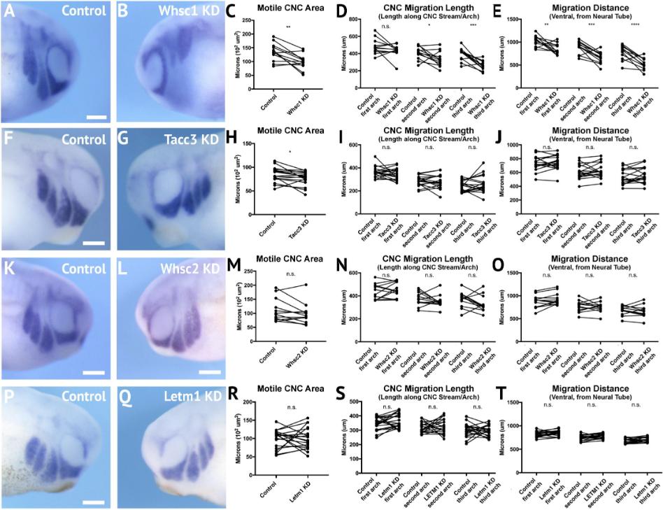 FIGURE 5. Knockdown of Whsc1 and Tacc3 decrease CNC migration in vivo. (A,B,F,G,K,L,P,Q) Anterior lateral views of tailbud stage embryos (depicted at st. 27), following whole mount in situ hybridization against twist. Each column of panels (A,B,F,G,K,L,Q) are lateral views of two sides of the same embryo. (CâE,HâJ,MâO,RâT) Measurements were taken for the total area of the three PA (Arch 1-3 extend anterior to posterior), the length of each individual arch, and the migration distance, as measured from the dorsal most tip of each arch to the neural tube. Embryos were stained and quantified at stages 25â30. (KâT) Letm1 or Whsc2 KD did not significantly affect any of the measured parameters. (FâJ) Tacc3 KD expression caused an 8.33% decrease in the total PA area, but did not affect length or arch migration. (AâE) Whsc1 KD caused a 23.57% decrease in PA area. Additionally, the length of the second and third pharyngeal arches decreased by 14.72 and 31.70%, respectively. The migration distance of the first, second and third pharyngeal arches decreased by 15.75, 24.04, and 29.29%, respectively. Significance determined using a studentâs paired t-test. (Embryos quantified: Whsc1 KD = 13, Tacc3 KD = 18, Whsc2 KD = 12, Letm1 KD = 19.) ââââP < 0.0001, âââP < 0.001, âP < 0.05, n.s., not significant. Scalebar is 250 μm. |