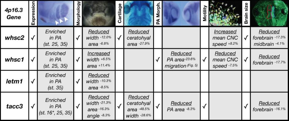 FIGURE 8. Partial depletion of WHS-affected genes demonstrates numerous impacts on craniofacial development and neural crest migration. Tissues are denoted as affected (checked box) if phenotypes were significantly different from control (p ⤠0.05); see individual figures for data distribution and statistics. (Abbreviations: PA, Pharyngeal Arch) âDenotes pre-migratory CNC (st. 16). |