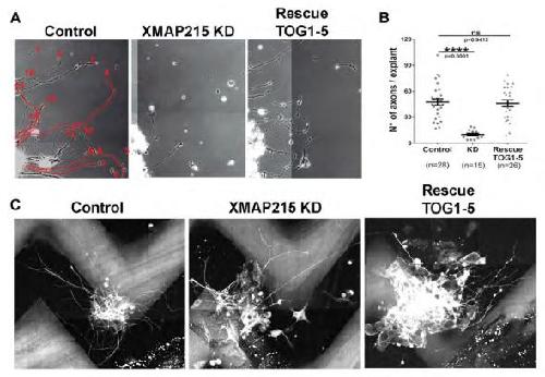 Supplemental Figure 2. (A-B) TOG1-5 rescues the axon outgrowth parameters affected by XMAP215 KD. A. Phase contrast images of axons from control, XMAP215 KD and XMAP215 KD rescued by TOG1-5 neural explants. Red numbers are shown as an example of axons considered for number of axon per explants quantifications. Only the axons with a clear end or growth cone were considered. Red lines denote the axon length, with only axons starting from the spinal cord explants, that are clearly separated from other axons and with a clear end or growth cone, were considered. B. XMAP215 KD decreases the number of axons per explant and can be rescued by TOG1-5 mRNA. C. Representative images from control, XMAP215 KD and XMAP215 KD rescued by TOG1-5 neural explants. Explants expressing LifeAct (F-actin marker). Grey stripes correspond to repellent EphrinA5-coated surface. Measurements taken of axons that were present and crossed onto repellent ephrin stripes per explant. |