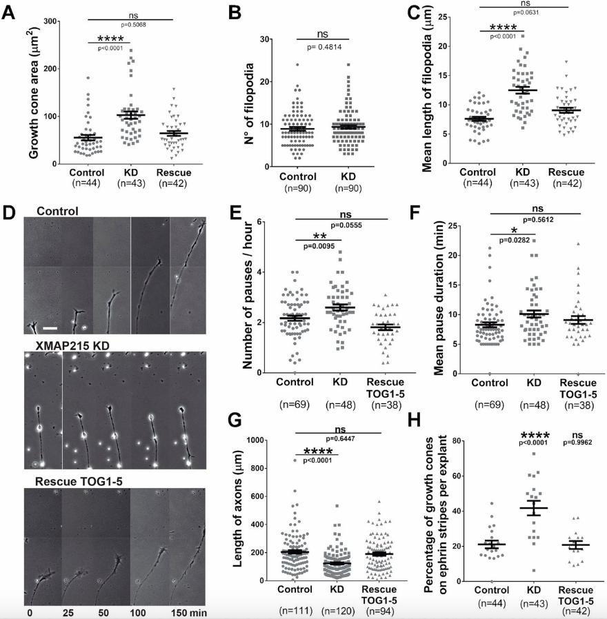 Figure 1: XMAP215 KD leads to global growth cone phenotypic changes and guidance defects. (AâC). XMAP215 KD induces growth cone pausing-like morphology. XMAP215 KD increases growth cone area (A), has no effect on number of filopodia (B), and increases the mean length of filopodia (C). See Fig. S1C for more information regarding how the quantifications were performed. (DâF). XMAP215 KD increases number and duration of growth cone pauses. (D) Time-lapse montage of representative axons from control, XMAP215 KD and XMAP215 KD rescued by expression of TOG1â5. Scale bar: 25â µm. XMAP215 KD increases the number of pauses per hour (E) and the mean pause duration (F). (G,H) TOG1â5 rescues the axon outgrowth parameters affected by XMAP215 KD. (G) XMAP215 KD decreases the length of axons. See Fig. S2A for more information regarding how the quantifications were performed. (H) XMAP215 KD increases the percentage of growth cones on Ephrin A5 stripes per explant. See Fig. S2C for representative images. *P<0.05; **P<0.01; ****P<0.0001; ns, not significant, from a one-way ANOVA analysis comparing multiple conditions, and from a Student's t-test when comparing XMAP215 KD to control. Data presented as mean±s.e.m. |