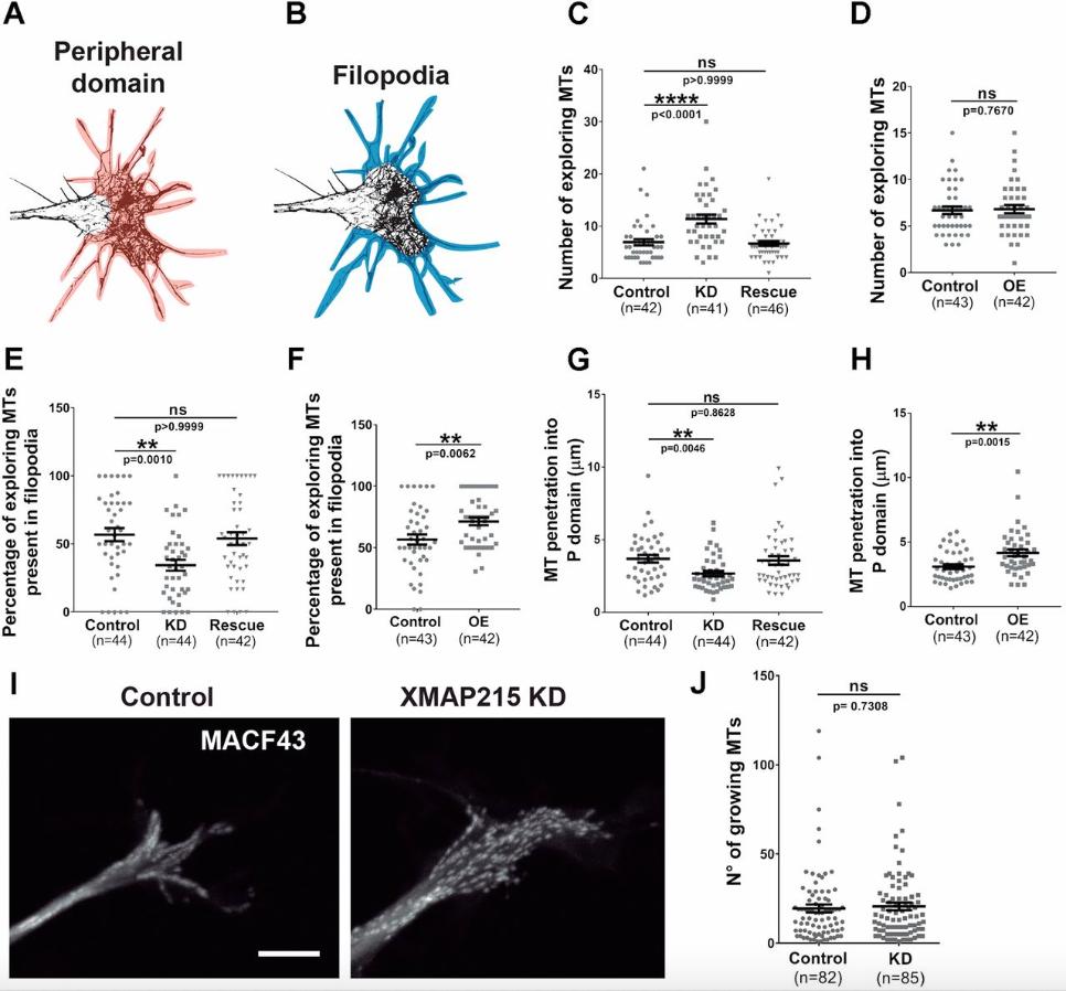 Figure 3: XMAP215 promotes penetration of MTs into growth cone filopodia. (A,B) Growth cone mask images outlining the growth cone peripheral domain colored in orange (A), and the filopodia colored in blue (B). (CâH). Quantification of MT penetration into the actin-rich peripheral domain of the growth cone after XMAP215 knockdown (KD) (C,E,G) or overexpression (OE) (D,F,H). XMAP215 KD increases the number of exploring MTs (C), while decreasing the percentage of exploring MTs present in filopodia (E), as well as MT penetration into the peripheral (P) domain (G), compared to controls. XMAP215 KD effects were rescued by co-expression of KD-resistant XMAP215âGFP mRNA (C,E,G). See Fig. S3 for more information regarding how the quantifications were performed. **P<0.01; ****P<0.0001; ns, not significant, from a one-way ANOVA analysis comparing XMAP215 KD, XMAP215 rescue and control, and from a Student's t-test comparing XMAP215 OE to control. (I) Micrograph overlays of GFPâMACF43 tracks from a 1â m time-lapse image series in control and XMAP215 KD neural tube explant growth cones. Scale bar: 8â µm. (J) No difference was observed between XMAP215 KD and control when comparing the number of growing MTs. ns, not significant from a Student's t-test analysis. Data presented as mean±s.e.m. |