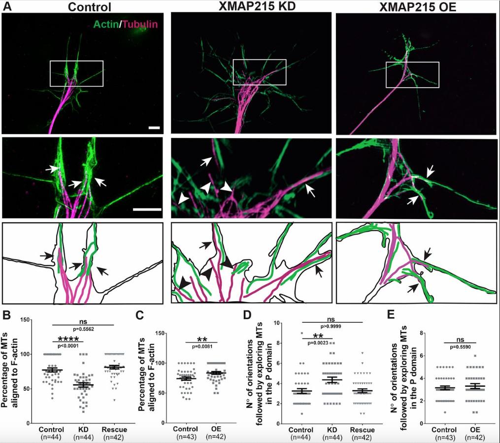 Figure 4: XMAP215 is required for normal MTâF-actin alignment in growth cones. (A) Top: representative SIM images of growth cones from control, XMAP215 KD and XMAP215 OE neural explants stained for actin and tubulin. Scale bar: 8â µm. Middle insets: magnification of the boxed region of interest in the upper panels. Scale bar: 3â µm. Arrows point to MTs that are aligned with F-actin, while arrowheads point to exploring MTs that are not aligned with F-actin. Bottom insets: âcamera lucidaâ-type depictions with subtracted background and highlighted MTs and F-actin. (B,C) XMAP215 KD decreases (B) while XMAP215 OE increases (C) the percentage of exploring MTs aligned to F-actin, compared to controls. (D,E). XMAP215 KD increases (D) while XMAP215 OE does not affect (E) the number of orientations followed by exploring MTs in the growth cone peripheral (P) domain. **P<0.01; ****P<0.0001; ns, not significant, from a one-way ANOVA analysis comparing multiple conditions, and from Student's t-test comparing XMAP215 OE to control. Data presented as mean±s.e.m. |