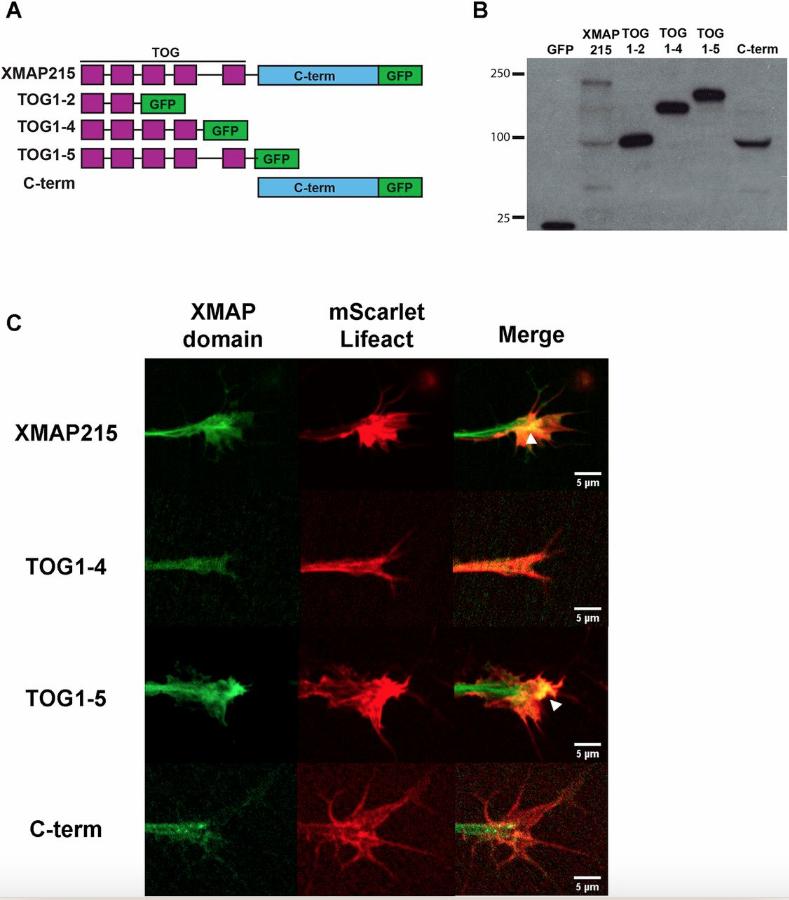 Figure 5: The N-terminal TOG1â5 domains of XMAP215 are necessary and sufficient to localize to F-actin in the growth cone periphery. (A) Schematic representation of the GFP-tagged XMAP215 domain constructs used, showing full-length XMAP215, XMAP215 domains TOG1â2, TOG1â4, TOG1â5 and C-terminal region (C-term). (B) Western blot showing the expression of the different XMAP215 domain constructs in Xenopus embryo lysates. (C) Representative confocal images showing localization of GFP-tagged XMAP215 mutants (green) and F-actin (red) in the growth cone. White arrowhead in full-length XMAP215 and TOG1â5 merged panels denote XMAP215 and actin fluorescence co-localization. Scale bar: 5â µm. (See Movies 1â4). |