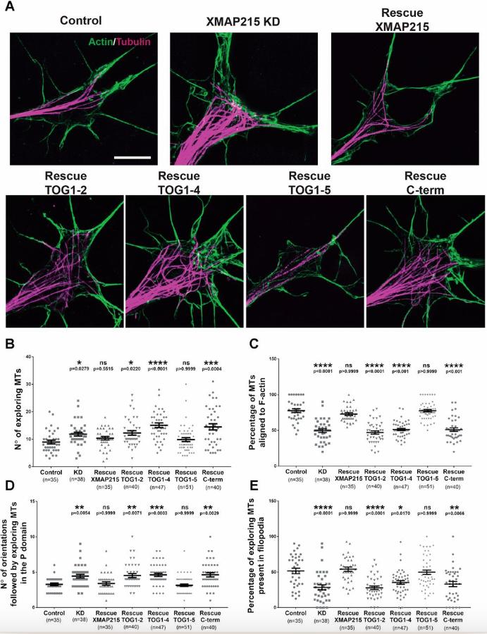 Figure 6: The N-terminal of XMAP215 is necessary and sufficient to promote MTâF-actin alignment. (A) Representative SIM images of growth cones from control, XMAP215 KD and XMAP215 KD rescue with the XMAP215 domain constructs as indicated. Scale bar: 5â µm. (BâE) Determination of the XMAP215 domain responsible for MTâF-actin alignment. Expression of TOG1â5, but not TOG1â2, TOG1â4 or C-term, rescues the increase in the number of exploring MTs (B), the decrease in the percentage of MTs aligned to F-actin (C), the increase in the number of orientations followed by exploring MTs in the peripheral (P) domain (D), and the decrease in the percentage of exploring MTs present in filopodia (E), induced by XMAP215 KD. *P<0.05; **P<0.01; ***P<0.001; ****P<0.0001; ns, not significant, from a one-way ANOVA analysis. Data presented as mean±s.e.m. |