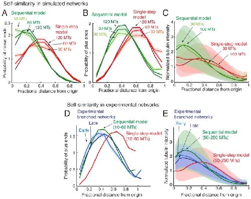 Figure 2—figure supplement 3. Self-similarity in the architecture of branched networks.(A–B) Positions of the minus-ends were recorded in simulated branched networks. The distances of all minus-ends were calculated from the origin, normalized by seed MT’s length, and the resulting probability distribution of was plotted in (A). The distances of all plus-ends were calculated from the origin, normalized by the largest distance (set to 1), and the resulting probability distribution of was plotted in (B). Data was obtained for roughly 250 branched networks containing 30, 60 or 120 MTs. Total number of measurements for single-step model (red): 30 MTs (n = 7535), 60 MTs (n = 14234), 120 MTs (n = 22655), and for sequential model (green): 30 MTs (n = 7602), 60 MTs (n = 15189), 120 MTs (n = 28300). (C) Tubulin intensity in simulated branched networks was measured against distance from the origin, normalized by the longest distance (set to 1). Data for obtained for roughly 250 branched networks each containing 30 or 100 MTs. Shaded regions depict the standard deviation in intensity measurements. (D) Positions of plus-ends were obtained in branched networks. Distances of all plus-ends was calculated from the origin, normalized by the largest distance (set to 1), and the resulting probability distribution of was plotted. For experiments, 17 branched networks generated were imaged over time and their plus-end distribution was measured when each network contained 10–30 EB1 comets (cyan, n = 8624), and 35–55 EB1 comets (blue, n = 17676). For simulated networks, data was pooled for 10–60 MTs in 250 branched networks each simulated using the single-step model (red, n = 633517) and sequential model (green, n = 495794). Shaded regions depict the 95% confidence intervals. The experiments and analyses were repeated with two independent extract preparations and representative experiment was reported. See Figure 2—figure supplement 2 and Materials and methods for measurement procedure. (E) Tubulin intensity in branched networks was plotted against distance from the origin, normalized by the longest distance (set to 1). Snapshots of branched networks were imaged at early time-point (10 min, cyan), and the same networks were imaged again later (14 min, blue). All measurements were pooled for 59 branched networks generated with one Xenopus extract preparation, and the experiments and analyses were repeated with two independent extract preparations. For simulations, data was pooled for 50–250 MTs in roughly 250 branched networks each simulated using the single-step model (red) and sequential model (green). Shaded regions depict the standard deviation in intensity measurements. See Figure 2—figure supplement 2 and Materials and methods for measurement procedure. |