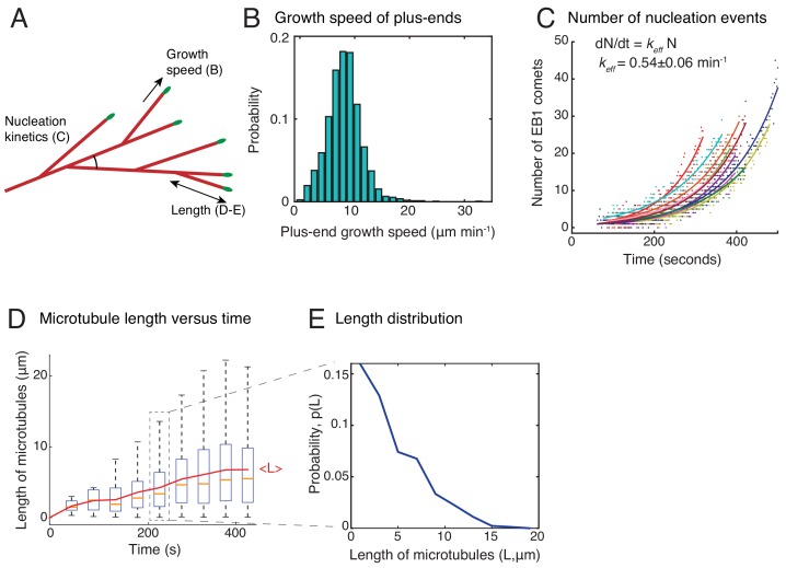 Figure 1—figure supplement 2. Characterization of branched microtubule networks.(A) Schematic representation of a branched network depicting parameters measured in (B–E). (B) Growth speed of plus-ends was obtained from EB1 tracks as described in Materials and methods. Histogram of n = 1691 EB1 tracks is displayed where all data was pooled from 20 branched networks. Mean growth speed was measured as 8.3 ± 2.5 μm min−1. Analyses in (B–E) are displayed for multiple branched networks generated in one Xenopus egg extract preparation, and were repeated with at least two independent egg extract preparations. (C) Number of EB1 comets were detected individually in 11 branched networks and plotted over time. Exponential curve [a exp(kt)] was fit to data points for each network, representing autocatalytic nucleation, and displayed in different colors. (D) Length of all MTs tracked in 20 branched networks was measured over time and plotted. The central mark displays the median length (yellow), and the edges of the box represent 25th and 75th percentiles. New MTs nucleated represent the near-zero lengths at later time points. The overlaid red curve represents the mean MT length over time. (E) Probability distribution of length of all MTs between 200–250 s is plotted. Data was pooled from 20 branched networks. |