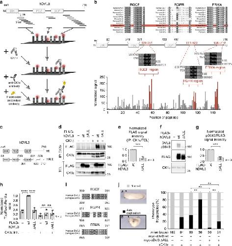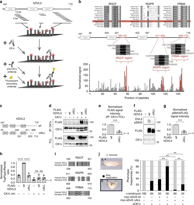 Fig. 3. The molecular and functional analysis of DVL3 regions interacting with CK1É. a The general workflow of a peptide array analysis: immobilized peptides were incubated with CK1ε, then with anti-CK1É antibody followed by fluorescent secondary antibodies, and detected by reading the fluorescence intensity. Peptide array contained the non-modified or phosphorylated peptide variants from the intrinsically disordered regions (IDRs) according to phosphorylation pattern by CK1ε, as mapped earlier29 (see Supplementary Fig. 3). b Identification of three regions (named RGCF, RGPR, and FRMA regions by their central 4 aa sequences), which bind CK1ε with high affinity. Multiple sequence alignment for the RGCF, RGPR, and FRMA regions of various Dvl/DVL isoforms is shown above. Residues with >80% similarity are highlighted and human DVL3 sequence is denoted by red box; only non-modified (i.e. non-phosphorylated) peptides are shown in this graph. c Generation of the N-terminal FLAG-tagged DVL3 âALL variant lacking the interaction interfaces (RGCF, RGPR, FRMA regions) and its subsequent analysis by d coimmunoprecipitation and e its quantification, f by western blot detection of the pS643 phosphorylation level and f its quantification, g and by Topflash Reporter Assay for the downstream Wnt/β-catenin signaling. h The multiple sequence alignment of Xenopus Dvl3 and human DVL3 sequences in the RGCF, RGPR, and FRMA regions is shown. i Analysis of the activity of the âALL variant derived from Xenopus xDvl3 in the Wnt/β-catenin canonical signaling (in the Xenopus laevis embryos). j Left: Representative image of control (low or no activity of the Wnt/β-catenin pathway; in a gray box) or duplicated (high activity; in a black box) axis in the Xenopus laevis embryos. Right: Quantification of the Xenopus laevis embryos with wild-type xDvl3 and the âALL variant. Experiments in dâf were performed in HEK DVL1-2-3â/â cell line. Data in e, g, h, j represent meanâ±âS.D. Data in h and j were analyzed by one-way ANOVA test with Gaussian distribution; Tukey's post-test was used for statistical analysis (*, pââ¤â0.05; **, pââ¤â0.01; ***, pââ¤â0.001, ****, pââ¤â0.0001; ns, not significant, pâ>â0.05); data in e and g were analyzed by Student's t-test |