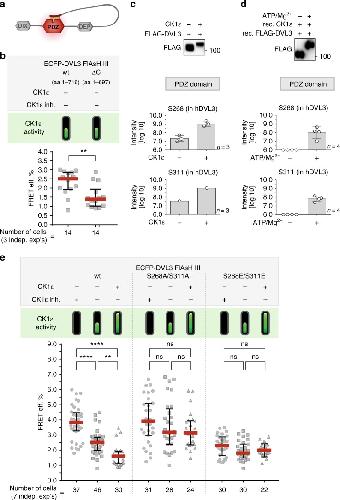 DVL3 FlAsH IâIV sensors uncover the role of CK1ε in DVL3 conformation. a The effects of the CK1δ/É inhibitor PF-670642 and the overexpressed CK1É on the downstream Wnt/β-catenin signaling of FLAG-DVL3 was quantified by TopFlash assay, b phosphorylation status detected either as phosphorylation-dependent mobility shift on SDS-PAGE or as an increased signal for pS643-DVL3 phosphorylation-specific antibody, and c changes in the localization of DVL3 (punctae phenotype plotted as white dots); DAPI was used for nuclei staining; scale bars: 10âμm. d Measurements of the intramolecular FRET efficiency of the ECFP-DVL3 FlAsH sensors IâIV in HEK293 wild-type cells are shown. One data point corresponds to one analyzed cell; datapoints from three independent transfections were merged. Data in a and c represent meanâ±âS.D., data in d represent medianâ±âinterquartile range. Statistical significance in a/d was analyzed by one-way ANOVA test with Gaussian distribution and Tukey's post-test (*pââ¤â0.05; **pââ¤â0.01; ***pââ¤â0.001, ****pââ¤â0.0001; ns, not significant, pâ>â0.05) |
