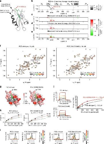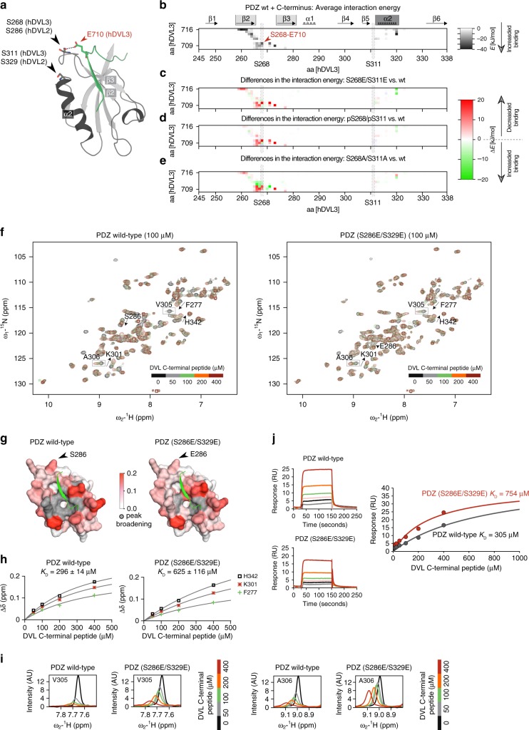 Fig. 6. PDZ phosphorylation regulates the interaction with the DVL C-terminal peptide. a Structure of DVL3 C-terminal peptide (aa 702–716; green) bound to the PDZ-binding pocket (PDZ domain from DVL3, aa 245–338; in silico ɑ-helices in dark and β-strands in light gray) observed in the in silico simulations. S268, S311, and C-terminus residue E710 participating in hydrogen bonds (dotted line) are highlighted with a stick model. b The matrix of mean interaction energy between each residue of PDZ domain aa 245–338 (x-axis) and DVL C-terminal peptide aa 709–716 (y-axis). Strength of the attraction of PDZ wt and C-terminus is depicted in white-black gradient. c–e The differences in mean interaction energies shown as a difference from wild-type PDZ wt: c PDZ (S268E/S311E), d PDZ (phospho-S268/phospho-S311), and e PDZ (S268A/S311A) between PDZ mutants. The change in the interactions are depicted in green (stronger) or red (weaker). Interactions of protein/peptide end caps are also displayed in the matrix. f–i NMR titrations of the DVL2 PDZ wild type and PDZ phosphomimicking variant (S286E/S329E; corresponding to S268 and S311 in DVL3) with DVL C-terminal peptide. f Overlay of 1H, 15N HSQC spectra for each titration point. Arrows indicate selected residues that exhibit fast exchange properties on the NMR timescale and gray boxes selected residues that exhibit intermediate-to-fast exchange properties on the NMR timescale. g Mapping of chemical shift perturbations on DVL-peptide (in green) structure from PDB database (PDB ID: 3CCO). Fast exchange residues colored using a gradient from white to red according to chemical shift perturbation and intermediate exchange residues that go beyond detection at the end of the titration colored in gray. S286, or E286 substitution, of DVL2 are highlighted by black arrow. h Binding isotherms for three residues that experience fast exchange during NMR titration. The apparent KD values represent the mean with the standard deviation for the three cross-peaks analyzed. i Experimental line shapes during the titration for two selected residues that experience intermediate-to-fast exchange. j SPR sensograms of DVL C-terminal peptide binding to wild type and S286E/S329E PDZ from DVL2 and the corresponding binding isotherms fitted to a one-site binding model. RU stands for response units, AU for arbitrary units |