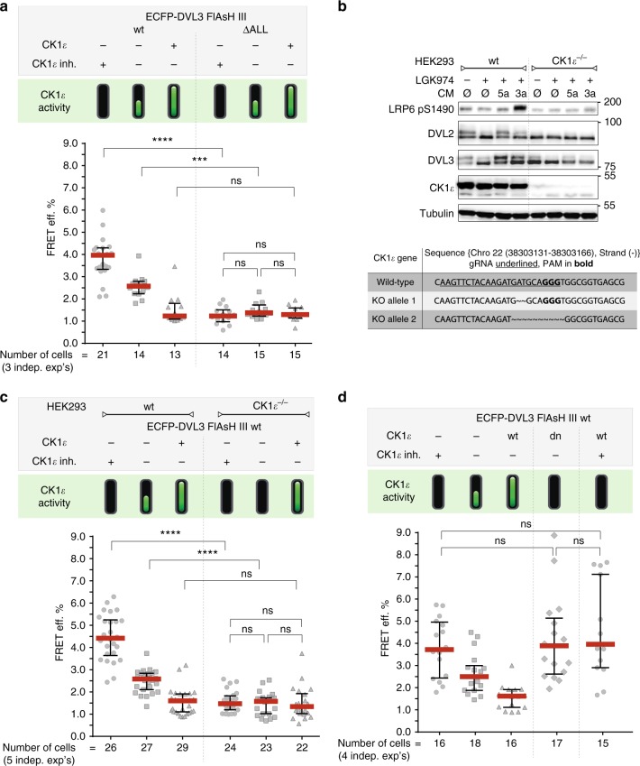 CK1ε is required for the conformational dynamics of DVL3. a Sequences corresponding to the ∆ALL variant were deleted in the ECFP-DVL3 FlAsH III sensor and the intramolecular FRET efficiency measurement of this variant (ECFP-DVL3 FlAsH III ∆ALL sensor) in HEK293 wild-type cells is shown. b Generation of the CK1ɛ−/−-deficient HEK293 cells using the CRISPR-Cas9 system and analysis of their capacity to respond to the Wnt-3a and Wnt-5a ligands was analyzed by western blotting. Bottom: Sequencing results for CK1ɛ locus targeted in CK1ɛ−/− cells are shown; sequences of gRNA, which were used, are underlined, the PAM sequence is in bold. c Measurements of the intramolecular FRET efficiency of the wt DVL3 FlAsH sensor III in HEK293 wild type and CK1ɛ−/−-deficient cells. d Measurements of the intramolecular FRET efficiency of the wt DVL3 FlAsH III sensor in HEK293 wild-type cells with dominant negative (dn) variant of CK1ɛ and wt CK1ɛ treated with the CK1δ/ε inhibitor are shown. Data in a, c and d: one dot represents one cell; data from three to five independent transfections were merged. Median ± interquartile range is indicated; one-way ANOVA test with Gaussian distribution and Tukey's post-test was used for statistical analysis (*, p ≤ 0.05; **, p ≤ 0.01; ***, p ≤ 0.001, ****, p ≤ 0.0001; ns, not significant, p > 0.05). CM: conditional medium, Ø: control, 5a: Wnt-5a, 3a: Wnt-3a |