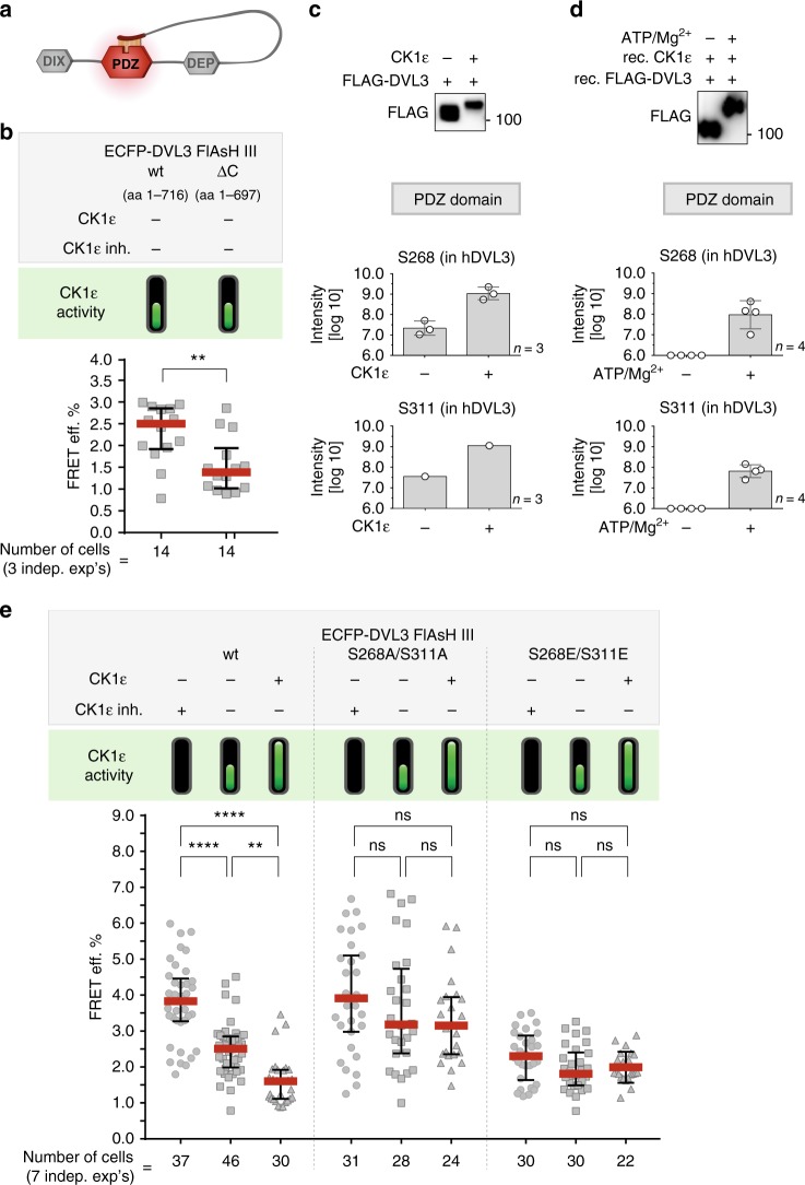 Fig. 5. Phosphorylation of PDZ domain controls the conformational dynamics of DVL3. a Schematic depiction of the closed conformation of DVL proposed here16, where seven last C-terminal aa (sequence: EFFVDIM) interact with the peptide-binding pocket of the PDZ domain. b Measurements of the intramolecular FRET efficiency of the wt DVL3 FlAsH sensors III (aa 1–716 in human DVL3) and the ∆C variant (aa 1–697) in HEK293 wild-type cells. c The western blot-based (above) and MS/MS-based (below) analyses of the CK1ε-induced phosphorylation of serine residues present in the PDZ domain of human DVL3. FLAG-DVL3 wt was overexpressed with/without CK1ε wt in HEK293 wt cells, immunoprecipitated, and the level of phosphorylation was analyzed by MS/MS. CK1ε-induced phosphorylation of S268 and S311 in DVL3 PDZ domain was detected. d In vitro kinase assay with recombinant FLAG-DVL3 and CK1ε analyzed by western blot (above) and MS/MS (below) confirms that S268 and S311 are direct phosphorylation sites of CK1ε. Values in c and d show absolute intensity of phosphorylated peptides plotted on a log10 scale. The detection limit is approximately 1.106, i.e. 6.0. Individual datapoints represent biological replicates. e Comparison of the intramolecular FRET efficiency of wt DVL3 FlAsH III sensor, non-phosphorylatable variant (S268A/S311A), and phosphorylation-mimicking variant (S268E/S311E) in wt HEK293 cells is shown. One data point corresponds to one analyzed cell; datapoints from 3 (b) and 7 (e) independent transfections were merged. Data in b and e represent median ± interquartile range and data in e were analyzed by one-way ANOVA test with Gaussian distribution and Tukey's post-test (*, p ≤ 0.05; **, p ≤ 0.01; ***, p ≤ 0.001, ****, p ≤ 0.0001; ns, not significant, p > 0.05). Data in b were analyzed by Student's t-test. Data in c and d represent mean ± S.D. |