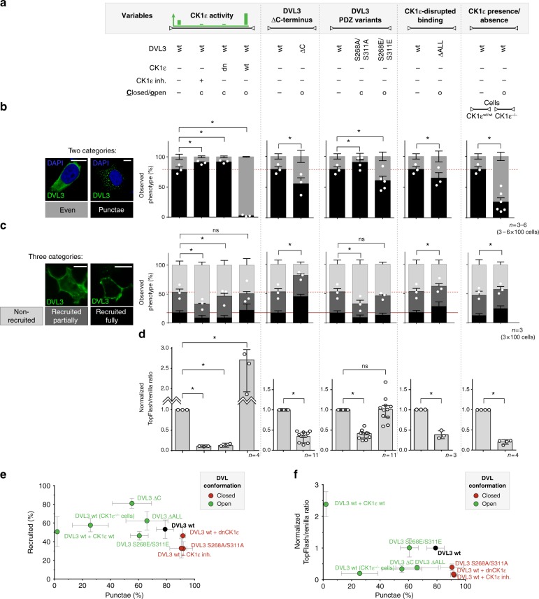 Fig. 8. DVL conformations correlate with DVL subcellular localization and membrane recruitment. a Conditions and variants with the defined conformational state identified by FlAsH-based FRET subjected to analyses in bâd; o indicates open, c indicates closed. b ECFP-tagged DVL3 was transfected to HEK293 wt cells as indicated. Subcellular localization was analyzed by anti-GFP immunostaining. Based on the pattern of ECFP-DVL3, cells were classified to have either even or punctate localization (plotted as white dots) of DVL3. Typical examples are shown in the left. Data represent average from three independent transfections with 100 cells counted in each condition per transfection. Identical control condition is shown several times for better clarity. c FLAG-tagged DVL3 and FZD6-mCherry were transfected in HEK293 DVL1/2/3â/â, wt, and CK1εâ/â cells as indicated. Subcellular localization was analyzed by anti-FLAG immunostaining. Based on the membrane localization of FLAG-DVL3, cells were classified to possess DVL3 either non-recruited, partially recruited, or fully recruited (the sum of partial and full DVL3 recruitment plotted as white dots). Typical examples are shown in the left. Data represent average from three independent transfections with 100 FZD6-mCherry-positive cells counted in each condition per transfection. Identical control condition is shown several times for better clarity. d Analysis of the Wnt/β-catenin downstream signaling monitored by Dual Luciferase TopFlash/Renilla Reporter Assay in HEK293 cells. Data in bâd represent meanâ±âS.D. and statistical significance in d was analyzed by one-way ANOVA test with Gaussian distribution and Tukey's post-test. For more details about the statistics used in Fig. 8b and c, please see the appropriate section in Methods (*, pââ¤â0.05; ns, not significant, pâ>â0.05). e, f Data obtained in bâd were plotted in the 2D graphs. Red color indicates the closed conformation; green indicates open. Error bars show S.D. for each parameter. % of recruited is a sum of partially recruited and fully recruited in c. DVL variants that are closed form a distinct population when membrane recruitment and subcellular localization is considered (e) but not when the TopFlash assay is included (f, and Supplementary Fig. 7a); dn dominant negative |