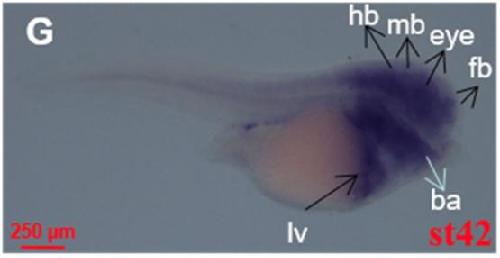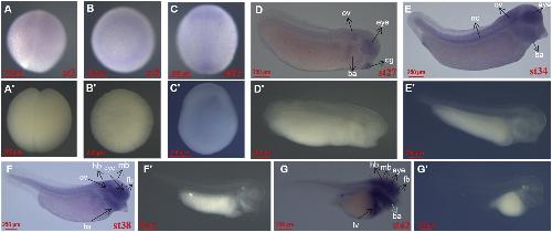 Fig. 3. Spatial pattern of fosl1 analyzed by whole mount in situ hybridization. (A and Aâ²) Stage 2, animal view. (B and Bâ²) Stage 8, animal view. (C and Câ²) Stage 13, dorsal view. (D and Dâ²) Stage 27, dorsal view. (E and Eâ²) Stage 34, lateral view. (F and Fâ²) Stage 38, lateral view. (G and Gâ²) Stage 42, lateral view. Ba, branchial arches; cb, cement gland; fb, forebrain; mb, midbrain; hb, hindbrain; lv, liver; nc, notochord; ov, otic vesicle. Aâ²-Gâ² indicates the sense probe control.