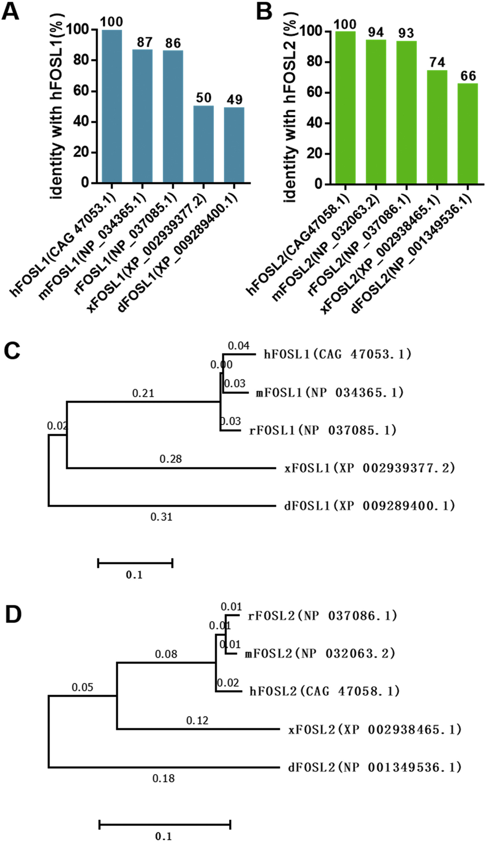 Fig. 1. Identification of two fosl genes from Xenopus tropicalis. (A and B) The identity ratio of protein sequence of human Fosl1 (A) and Fosl2 (B) compared with homologs in other vertebrates. M, mouse; r, rat; x,Xenopus tropicalis; d, Danio rerio. (C and D) Phylogenetic analysis of Fosl1(C) and Fosl2 (D) proteins from Xenopus tropicalis, human, mouse, rat,and Danio rerio.