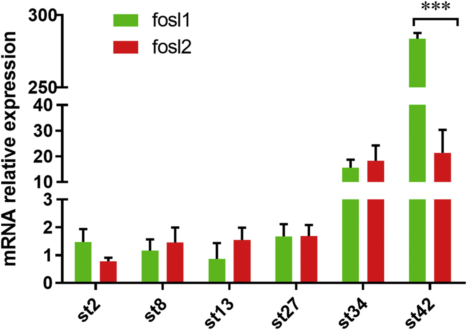 Fig. 2. Temporal expression of fosl genes in early development of X. tropicalis. The mRNA expression of fosl1 and fosl2 genes was analyzed by qPCR using total RNA isolated from X. tropicalis embryos at indicated developmental stages. Ornithine decarboxylase (odc) was used as the internal standard control. Results are presented as mean ± SEM (n = 4 experiments), ***p < 0.001. St, stage.