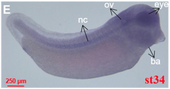 fosl1 (FOS-like antigen 1 ) gene expression in Xenopus tropicalis embryo, assayed via in situ hybridization, NF stage 34, lateral view, anteriorright, dorsal up.
