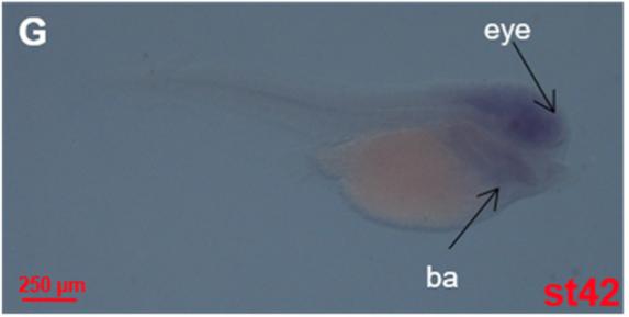 ???displayArticle.abstract??? Fos-like antigens (Fosl) including Fosl1 and Fosl2 exclusively heterodimerize with Jun members to form AP-1 complex, thereby participating in various cellular progresses including cell cycle regulation. However, expression patterns of these two genes during embryonic development remains largely unknown. In the present study, both temporal and spatial expression patterns of fosl1 and fosl2 were examined during embryonic development of Xenopus tropicalis. Real-time quantitative PCR results showed that the expression of the two genes was increased from stage 2 to stage 42. However, expression level of fosl1 is much higher than that of fosl2 at stage 42. Whole-mount in situ hybridization showed that fosl1 was expressed in eyes, branchial arch, notochord, otic vesicle, and liver. However, fosl2 was expressed in lungprimordium from stage 34 to stage 38, in addition to the moderate expression in eyes and branchial arch at stage 42. Thus, the developmental expression patterns of these two fosl genes is different in Xenopus embryos. These results provide a basis for further functional study of these two genes.