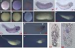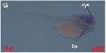 Fig. 4. Spatial pattern of fosl2analyzed by whole mount in situ hybridization. (A and Aâ²) Stage 2, animal view. (B and Bâ²) Stage 8, animal view. (C and Câ²) Stage 13, dorsal view. (D and Dâ²) Stage 27, dorsal view. (E and Eâ²) Stage 34, lateral view. (F and Fâ²) Stage 38, lateral view. (G and Gâ²) Stage 42, lateral view. (H) Transverse sections of embryos at the levels illustrated by broken black lines in F. (Hâ²) Large magnification of image shown in H. Ba, branchial arch; nc, notochord. Aâ²-Gâ² indicates the sense probe control.