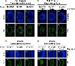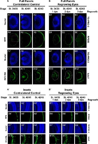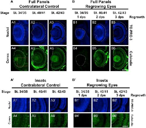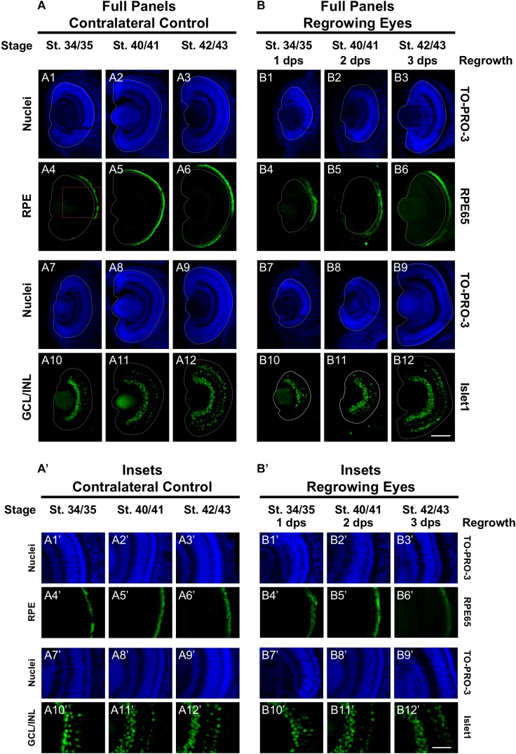 FIGURE 2. Regrown eyes regain retinal differentiation by 3 dps. Images shown are immunostained, transverse sections at three developmental timepoints corresponding to 1, 2, and 3 days post surgery (dps). (A,B) The contralateral control eyes (unoperated) complete retinogenesis by st. 41. By 1 dps, RPE is already visible in the regrowing eye as shown by anti-RPE65 signal (retinal pigmented epithelium; green). By 3 dps, Islet1 expression (identifying subpopulations of retinal ganglion cells and subsets of amacrine cells, bipolar cells, and horizontal cells; green) show expected retinal patterning of a mature eye. White dashed lines delineate each eye. (Aâ,Bâ) Images shown in panels Aâ and Bâ correspond to the region shown in the inset box in panel A4 for the corresponding (A or B) panel at high magnification. Blue color indicates nuclear staining (TO-PRO-3). Sample sizes: 1 day, n = 5; 2 days, n = 7; and 3 days, n = 6. (A,B, Aâ,Bâ) Up = dorsal, down = ventral, lens is on the left. Scale bar: (A,B) = 100 μm and (Aâ,Bâ) = 50 μm. |