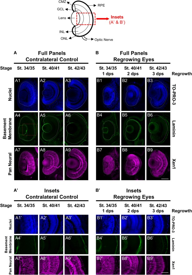 FIGURE 1. Regrown eyes regain cellular patterning by 3 dps. Images shown are immunostained, transverse sections at three developmental timepoints corresponding to 1, 2, and 3 days post surgery (dps). The top schematic is a diagram of a section through a mature, differentiated tadpole eye. (A,B) Regrowing eyes display retinal patterning comparable to the contralateral control eyes (unoperated) by 3 days. White dashed lines delineate each eye. (Aâ,Bâ) Representative images shown in panels Aâ and Bâ correspond to the region shown in the inset box in panel A4 for the corresponding A or B panel at high magnification. Blue color indicates nuclear staining (TO-PRO-3). Green color indicates the basal lamina (anti-Laminin), which is expressed in all basement membranes and outlines the optic vesicle. Magenta color indicates neural tissues (Xen1). Sample sizes: 1 day, n = 6; 2 days, n = 5; and 3 days, n = 5. (A,B, Aâ,Bâ) Up = dorsal, down = ventral, lens is on the left. Scale bar: A,B = 100 μm and Aâ,Bâ = 50 μm. |