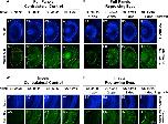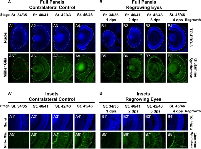 FIGURE 5. Regrown eyes regain Müller glia differentiation by 4 dps. Images shown are immunostained, transverse sections at four developmental timepoints corresponding to 1, 2, 3, and 4 days post surgery (dps). (A,B) Regrown eyes show differentiation of Müller glial cells beginning at 2 dps. However, proper patterning of Müller glial cells is delayed in the regrowing eyes when compared to the contralateral control eyes until 4 dps. White dashed lines delineate each eye. (A’,B’) Images shown in panels A’ and B’ correspond to the region shown in the inset box in panel A5 for the corresponding A or B panel at high magnification. Blue color indicates nuclear staining (TO-PRO-3). Green color indicates anti-Glutamine Synthetase (identifies Müller glial). Sample sizes: 1 day, n = 5; 2 days, n = 5; and 3 days, n = 5. (A,B, A’,B’) Up = dorsal, down = ventral, lens is on the left. Scale bar: A,B = 100 μm and A’-B’ = 50 μm. |