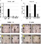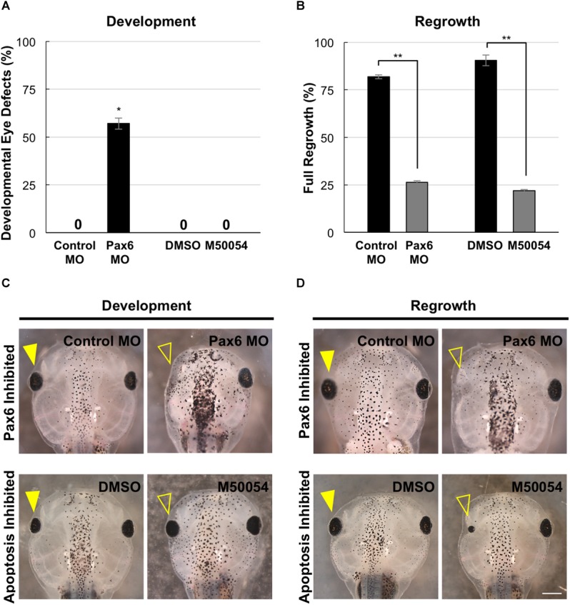 FIGURE 7. Development and regrowth require Pax6, but only regrowth requires apoptosis. (A) Comparison of developmental eye defects percentage from embryos injected at the 4-cell stage (1 blastomere) with either the control or Pax6 morpholino or treated with DMSO control or M50054 at st. 10. A zero denotes no abnormal phenotype in the control by st. 27. âdenotes p < 0.05 (n > 90). Data are means ± SEM. (B) Graphical representation of tadpoles achieving full eye regrowth at 5 dps (st. 46) with morpholino injection or apoptosis inhibitor treatment. ââdenotes p < 0.01 (n > 20). Data are means ± SEM. (C,D) Comparison of requirements for eye development and regrowth. (C) Pax6 morpholino injected tadpoles show reduced eyes when compared to the control by st. 46 in development. Apoptosis inhibitor show no effect on eye development (n > 30 per condition). Closed yellow arrowhead indicates eye of control, untreated tadpole. Open yellow arrowhead indicates eye of treated tadpole. (D) Pax6 morpholino and apoptosis inhibitor affects eye regrowth (n > 30). Closed yellow arrowhead indicates the eye of a control, untreated tadpole. Open yellow arrowhead indicates the eye of an inhibitor treated tadpole. (C,D) Up = anterior, down = posterior. Scale bar: C,D = 500 μm. |