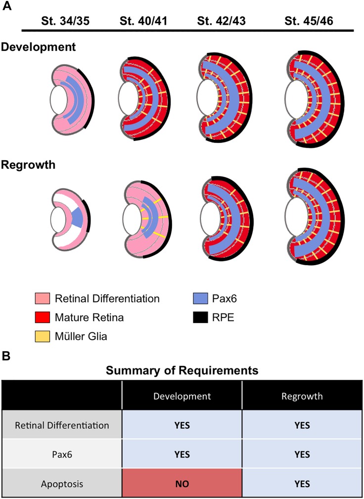 FIGURE 8. Summary. (A) A summary of retinal cell differentiation during regrowth as compared to development. The stages correspond to 1, 2, 3, and 4 days post surgery (dps), respectively. (B) Summary of required processes identified in eye development and regrowth. |