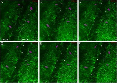 Figure 3. Loss of Cdc42ep3 disrupted somite segmentation and cell shape changes. Wilson explants were dissected from embryos receiving membrane-tethered EGFP (EGFP-CAAX) on one side, and CEP3-MO plus EGFP-CAAX on the other side, and the segmentation process was followed by time-lapse microscopy. (AF) Time frames at 2-hr intervals. The dashed lines in (A) marks the boundaries between pre-somitic mesoderm and the notochord. Arrowheads marked segmentation furrows. Two cells on each side of the explant were followed by magenta shade. CEP3-MO not only impaired somite segmentation, but also affected the mediolateral elongation of cells. Scale bar = 100 um.