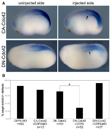 Figure 4. Cdc42 needs to be tightly controlled during somite segmentation. (A) 0.05 ng of constitutively active (CA) or dominant negative (DN) Cdc42 was injected into one side of the embryo, and their effect on somite segmentation was examined by the expression of myod1. Comparing to the uninjected control side, the segmented expression pattern of myod1 was lost on the injected side (arrows), suggesting that both increased and decreased activity of Cdc42 will affect somite segmentation. (B) CA-Cdc42 was co-injected with CEP3-MO, and CEP3 or CEP3-MO was co-injected with DN-Cdc42 to determine whether they can rescue segmentation defects caused by CEP3 or Cdc42 knockdown. The percentage of embryos with segmentation defect was summarized in the bar graph. chi-2 test indicates that CA-Cdc42 failed to rescue segmentation defects caused by CEP3-MO (p = 0.52), but CEP3 significantly rescued segmentation defects caused by DN-Cdc42 (*p < 0.01). Coinjection of CEP3-MO with DN-Cdc42, on the other hand, further inhibited somite segmentation (p = 0.02 when comparing with DN-Cdc42 alone).