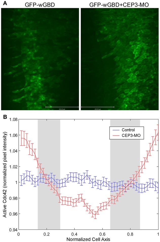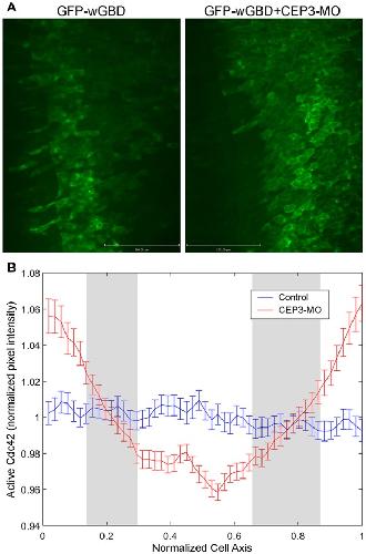 Figure 5. CEP3-MO regulates Cdc42 activity in the developing somite. GFP-wGBD that binds to active Cdc42 was expressed in the paraxial mesoderm alone or together with CEP3-MO. (A) While GFP-wGBD was largely internalized and distributed in a diffused manner in control somitic cells, it was localized to the cell membrane in CEP3-MO-injected cells, reflecting a higher level of Cdc42 activity. (B) An intensity plot of GFP-wGBD across the mediolateral axis of cells was generated. There was a significantly higher level of GFP-wGBD at the cell periphery in CEP3-MO-injected cells and a significantly lower level of GFP-wGBD in the center of CEP3-MO-injected cells. Error bars: standard error of the mean. Student t-test was performed, and the gray area marks places where p > 0.01.