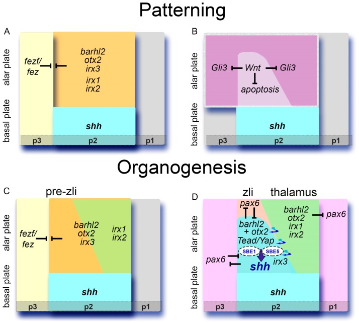 Figure 2. A model for zli formation. (A) During neural plate patterning the diencephalic primordium expresses otx2, barhl2 and irx1, irx2, irx3 (orange). Cross-repressive interactions between Fezf/Fez and Irx homeoproteins contribute to formation of the p2/p3 alar border. shh (light blue) is expressed in the p2 basal plate. (B) Concomitantly, a Wnt-mediated signal promotes survival of zli anlage cells, and gli3 expression is repressed through a Wnt-mediated signal in a narrow band of cells that correspond to the zli primordium. (C) At the onset of zli formation a permissive environment is established in the future zli, and zli cells acquire the competence to express shh. The zli anlage is characterized by the expression of barhl2, otx2, irx3 (orange), and the future thalamus by the expression of barhl2, otx2, irx1/2/3 (green). At the onset of zli development, irx3 is expressed in the future thalamus territory. (D) Using a sequential induction mechanism, Shh secreted by the basal plate initiates the spreading of shh expression into the pre-zli domain. Transcription factors (TFs) including Otx1, Otx2, Barhl2, YapâTead, and possibly unidentified TFs (TF-X) are recruited to the enhancers SBE1 and SBE5 to initiate shh transcription within the zli. Under the inductive influence of secreted N-Shh, some irx3-expressing cells located in caudal p2 sort out from thalamic cells. Shh signaling from the zli induces the repression of pax6 within the mid-diencephalic furrow. Pax6 together with unidentified dorsal signals could in turn prevent Shh from being expressed beyond the zli. The thalamus (p2) and the prethalamus (p3) receive a combination of Shh signals coming from two orthogonally oriented signaling centers, the zli and the basal plate. Together, they establish a morphogenetic gradient of Shh protein that patterns the thalamus posterior to the zli and the prethalamus anterior to the zli. p: prosomere; zli: zona limitans intrathalamica. |