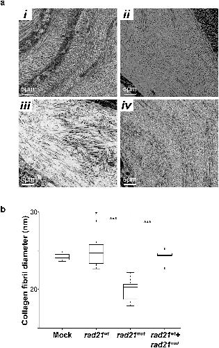 a. Electron microscopy images of collagen fibrils in corneal stroma. Organized pattern of collagen fibrils were observed (i) in non-injected eyes, (ii) in eyes with rad21wt injection and (iv) in eyes co-injected with rad21wt and rad21mut. Panel iii shows disrupted collagen fibril organization in eyes with rad21mut injection. b. Quantification of diameters of cornea collagen fibrils. For each group, at least 100 cornea collagen fibrils were counted. Error bars represent standard deviations. Statistics is performed using Mann-Whitney U test with * and *** indicating p-values of 0.0238 and 0.0043 respectively.