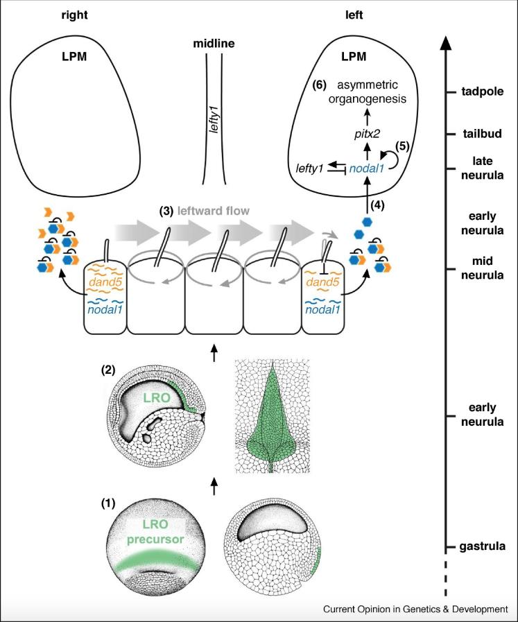 (1) Foxj1 expression (green) in the early gastrulaembryo marks the LRO precursor (superficial mesoderm), from which (2) the LRO derives when the SM involutes to line the roof of the primitive gut. (3) Central LRO cells harbor motile cilia which polarize to the posterior cell poles and rotate in a clockwise manner to generate a leftward flow of extracellular fluids. LateralLRO cells possess immotile cilia and co-express nodal1 (blue) and the Nodal inhibitor dand5 (orange). Flow sensing at the leftLRO margin results in dand5 down-regulation, which allows Nodal to signal and (4) transfer to the LPM. In the leftLPM, (5) Nodal signaling induces the three target genes of the nodal cascade, nodal1 itself, the feedback inhibitor lefty1 and the homeobox transcription factor pitx2. Spreading of left-asymmetric signaling is prevented by lefty1 expression at the midline (notochord and floor plate). (6) The Nodal cascade in due course drives asymmetric organ morphogenesis.